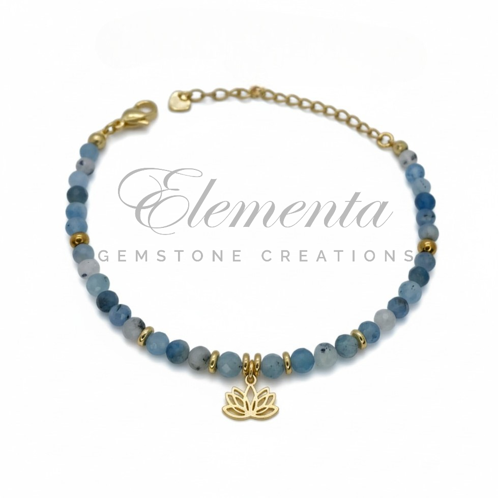 Armband van facet geslepen aquamarijn en lotus bedel. Sluiting door middel van karabijnslotje en verlengketting. Keuze uit goud of zilver.
