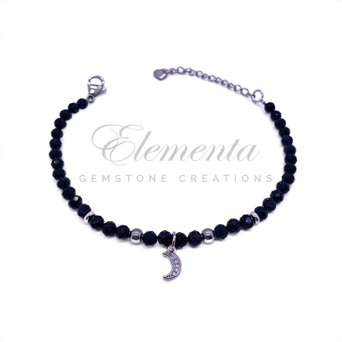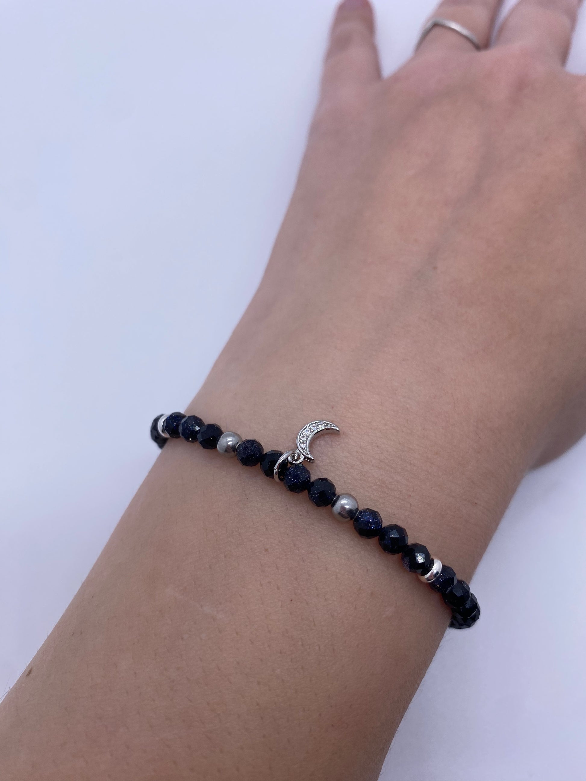 Armband van facet geslepen blauwe goudsteen en maan bedel met zirkonia steentjes. Sluiting door middel van zilverkleurig karabijnslotje en verlengketting.