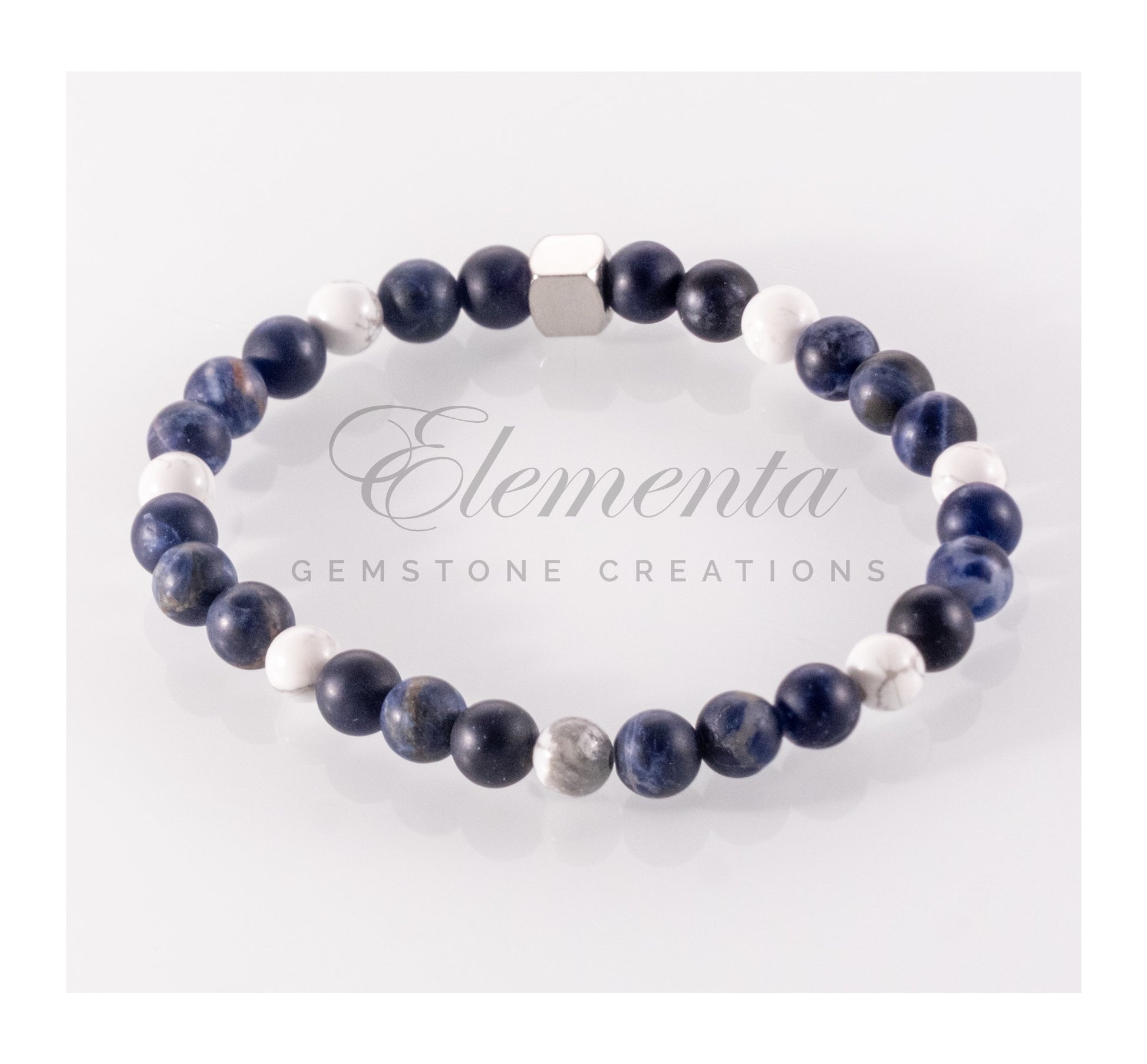 Elastische armband van sodaliet (mat), howliet en zilver element.