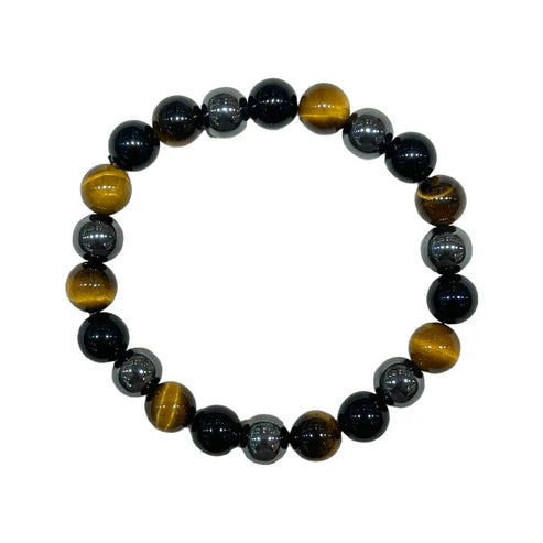 Elastische armband van tijgeroog, hematiet en zwarte obsidiaan van AA+ kwaliteit.