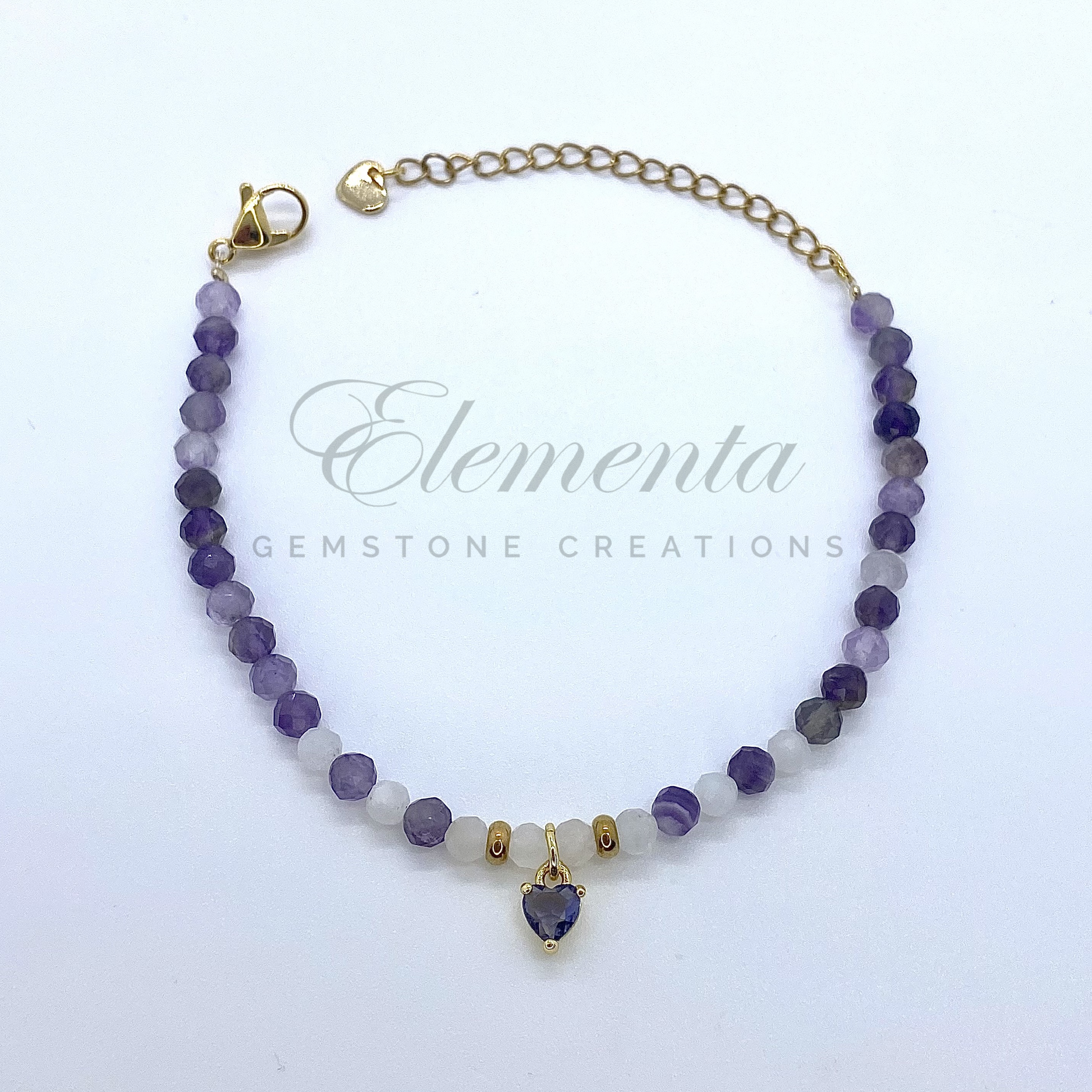 Armband van facet geslepen lepidoliet, maansteen en paarskleurig zirkonia hartjes bedel. Sluiting door middel van goudkleurig karabijnslotje en verlengketting.