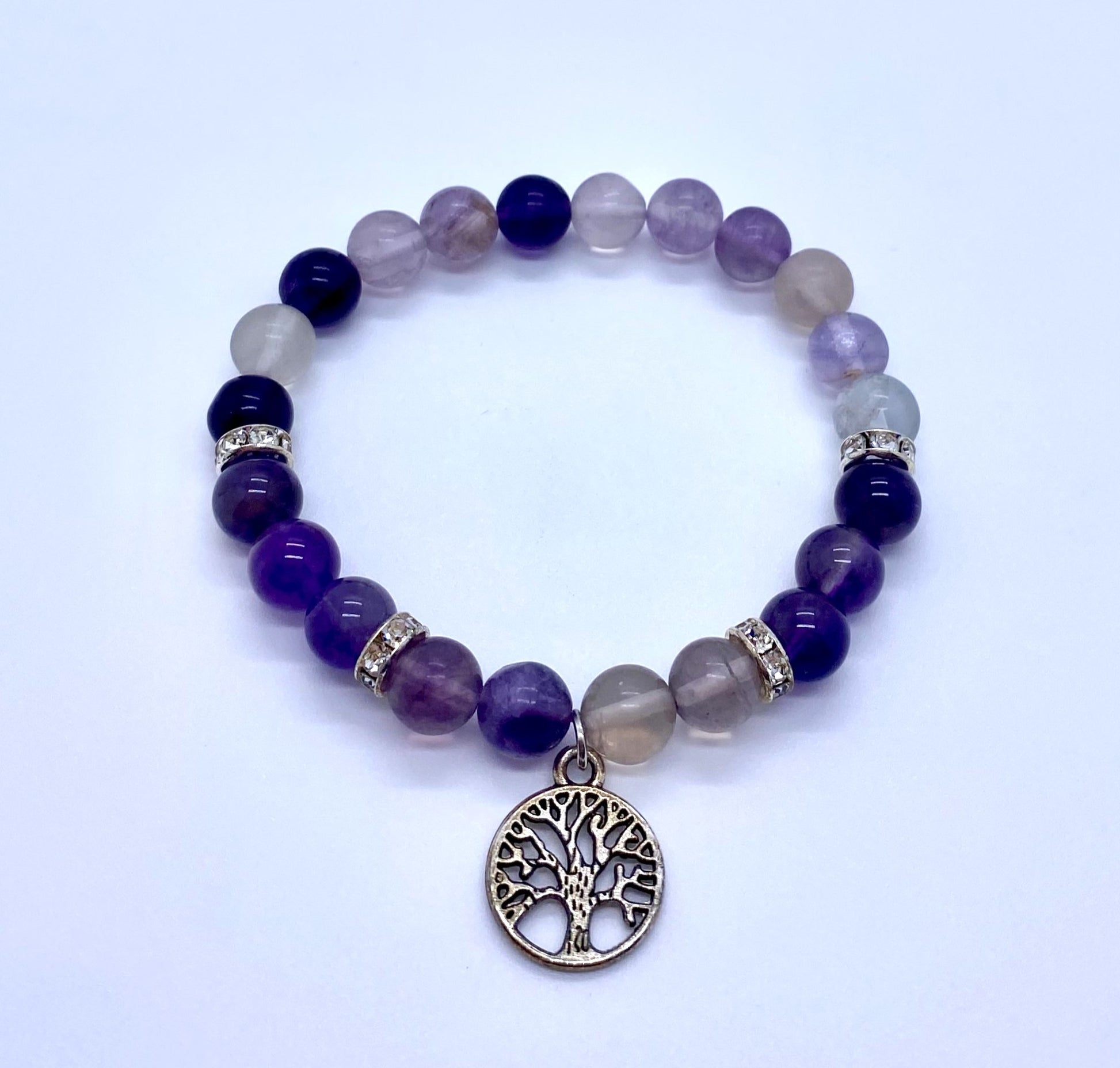Elastische armband van fluoriet, amethist en boom des levens bedel.